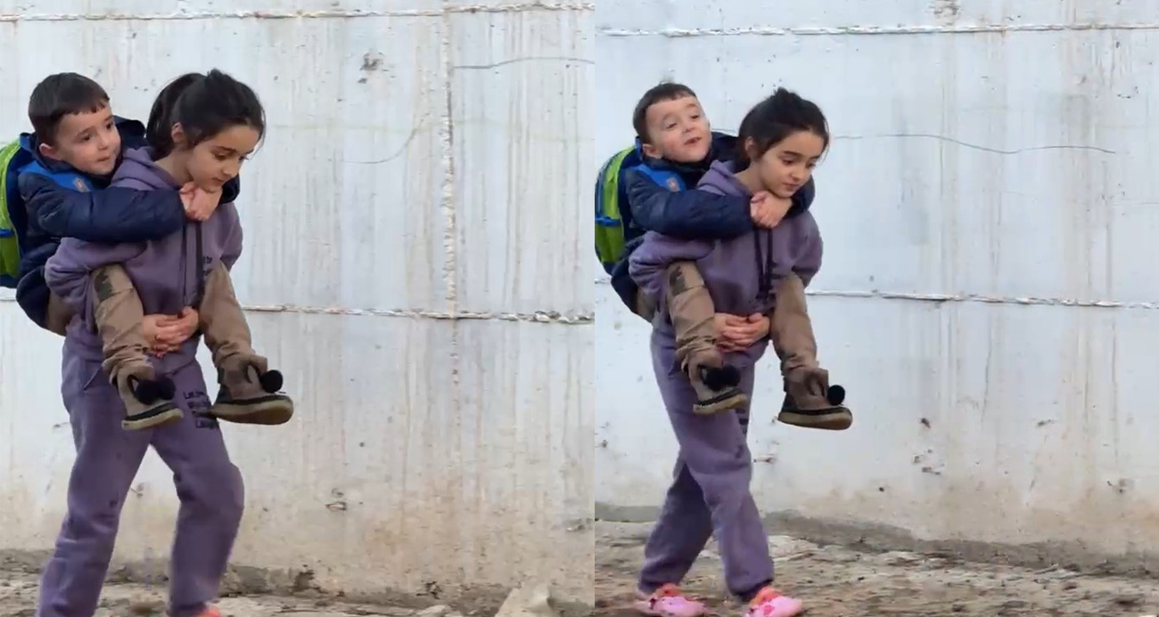Batman’da vefakar abla, cadde ve sokakların çamur olmasından dolayı kardeşini sırtında taşıyarak okula götürdü. O anlar bir vatandaşın cep telefonu kamerasına yansıdı.