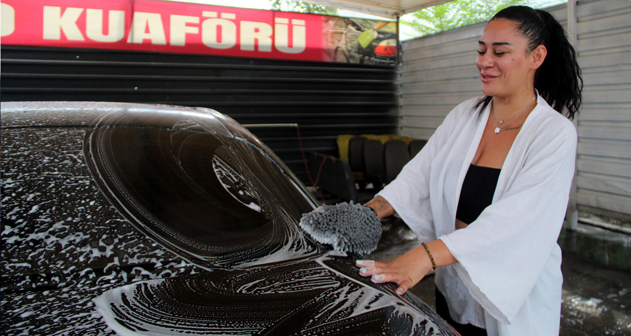 Sarı Çizmesini Giyip Ojeli Tırnaklarıyla Otomobilleri Pırıl Pırıl Yapıyor