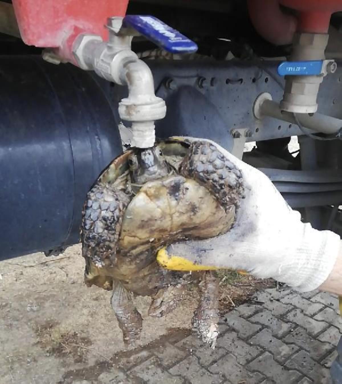 Yangından etkilenen kaplumbağaya itfaiyecilerden can suyu