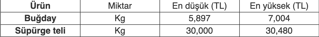 Borsada işlem gören ürünler ve fiyatları şöyle:
