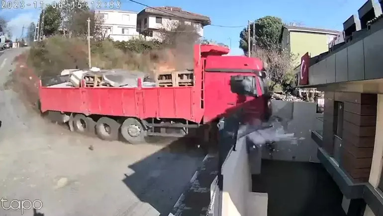 Sarıyer'de inşaat malzemesi yüklü TIR'ın şoförü adres sormak için aracı park ederek indi. TIR bir anda yokuş aşağı kaymaya başladı. TIR'ın şoförünün olmadığını fark eden öğrenci servisi şoförü geri geri giderek olası bir faciayı engelledi. Bir otomobil ile güvenlik kulübesini teyet geçen TIR, binaya girmek üzereyken duvara çarparak durdu. O anlar güvenlik kamerasına yansıdı.