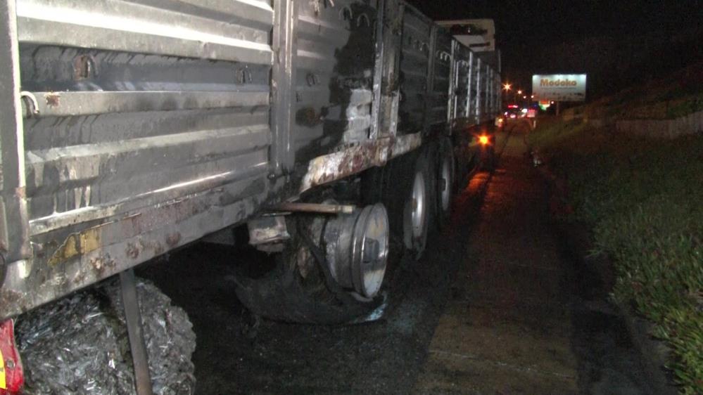 Hisarcıkta seyir halindeki kamyonun tekerleği patlayıp alev aldı