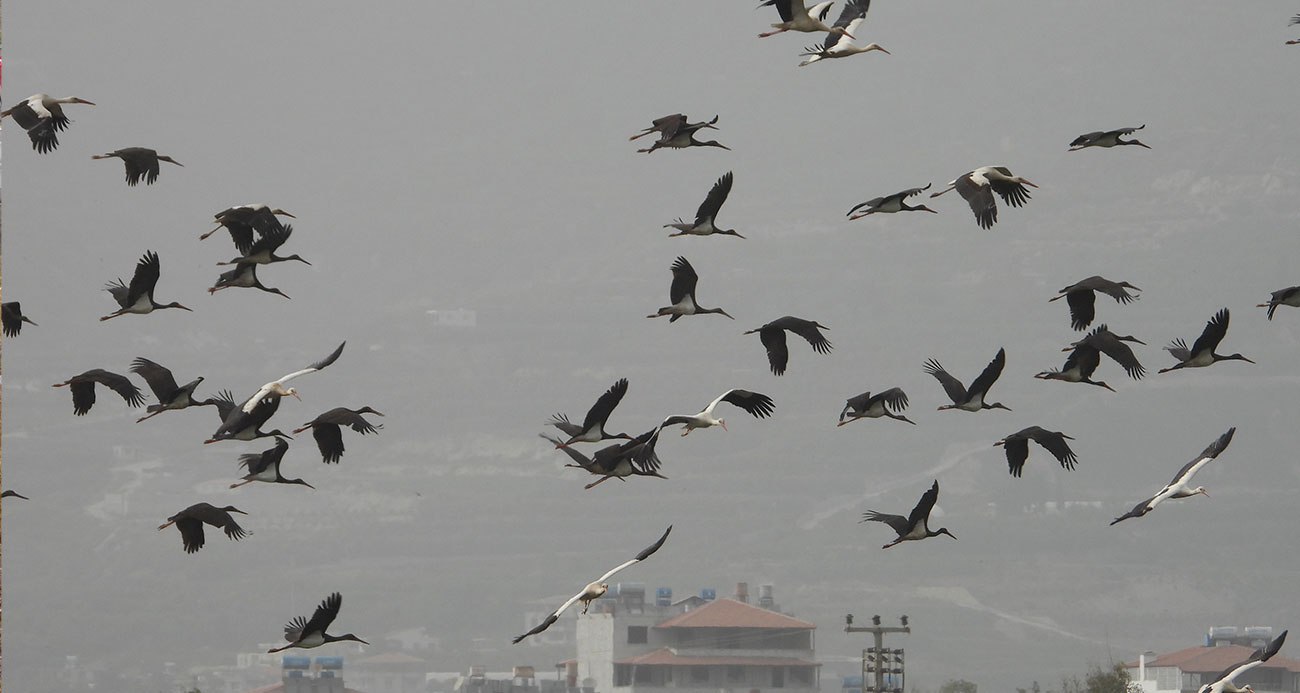 Göç yolundaki leyleklerin gökyüzündeki dansı