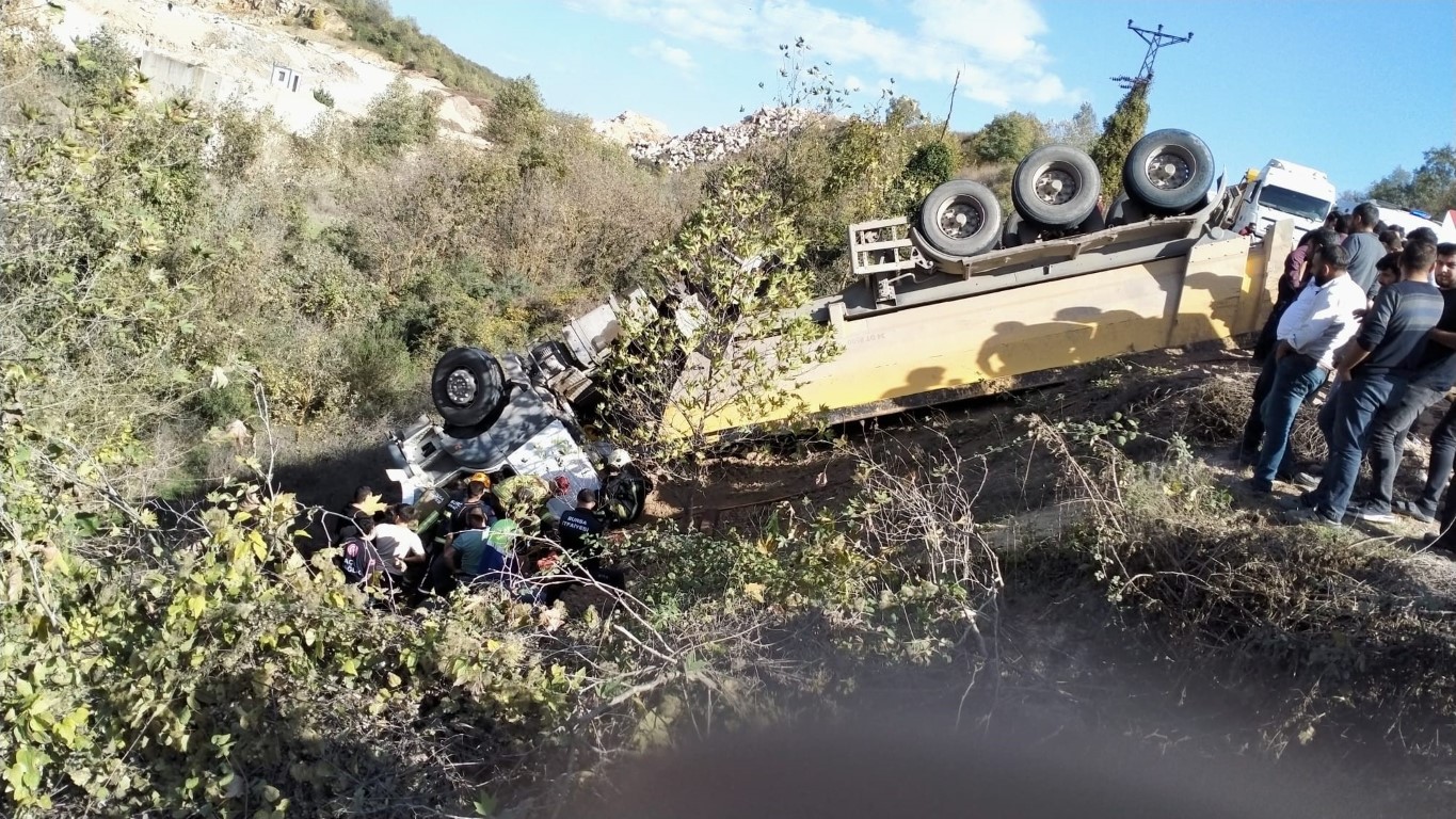 İş makinesi taşıyan kamyon dereye devrildi 1 ölü 1 yaralı