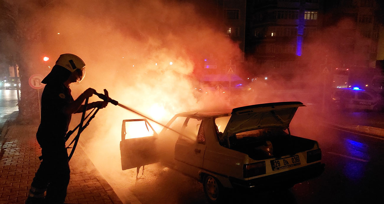 Kırmızı ışıkta bekleyen otomobil alev alev yandı